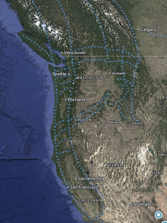 Below: From The NorthWest Projects: 2024 Report, a simple model identifying macro FMC paths, conduits and hubs one can connect to at continental scale in the Pacific Northwest USA. The blue dots simply trace forested areas as shown on Google Maps.