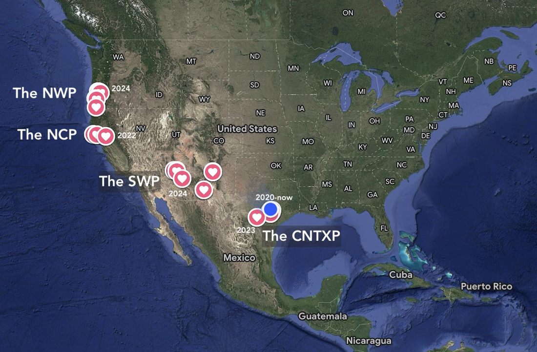 Chris Searles’ Strategic Watering sites from projects in Oregon, California, Arizona, New Mexico and Texas, 2020-2024, according to living forest infrastructure. More info here.